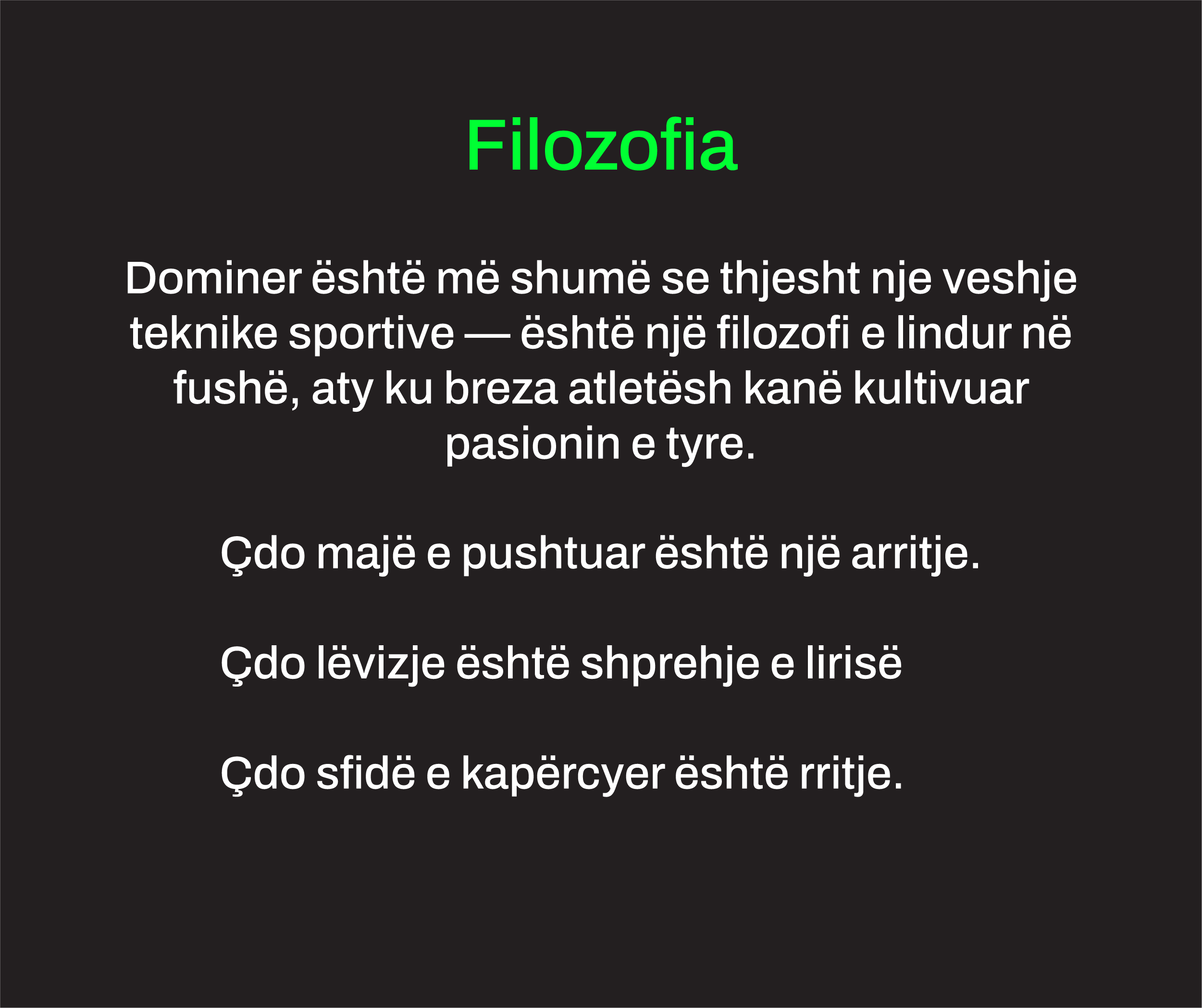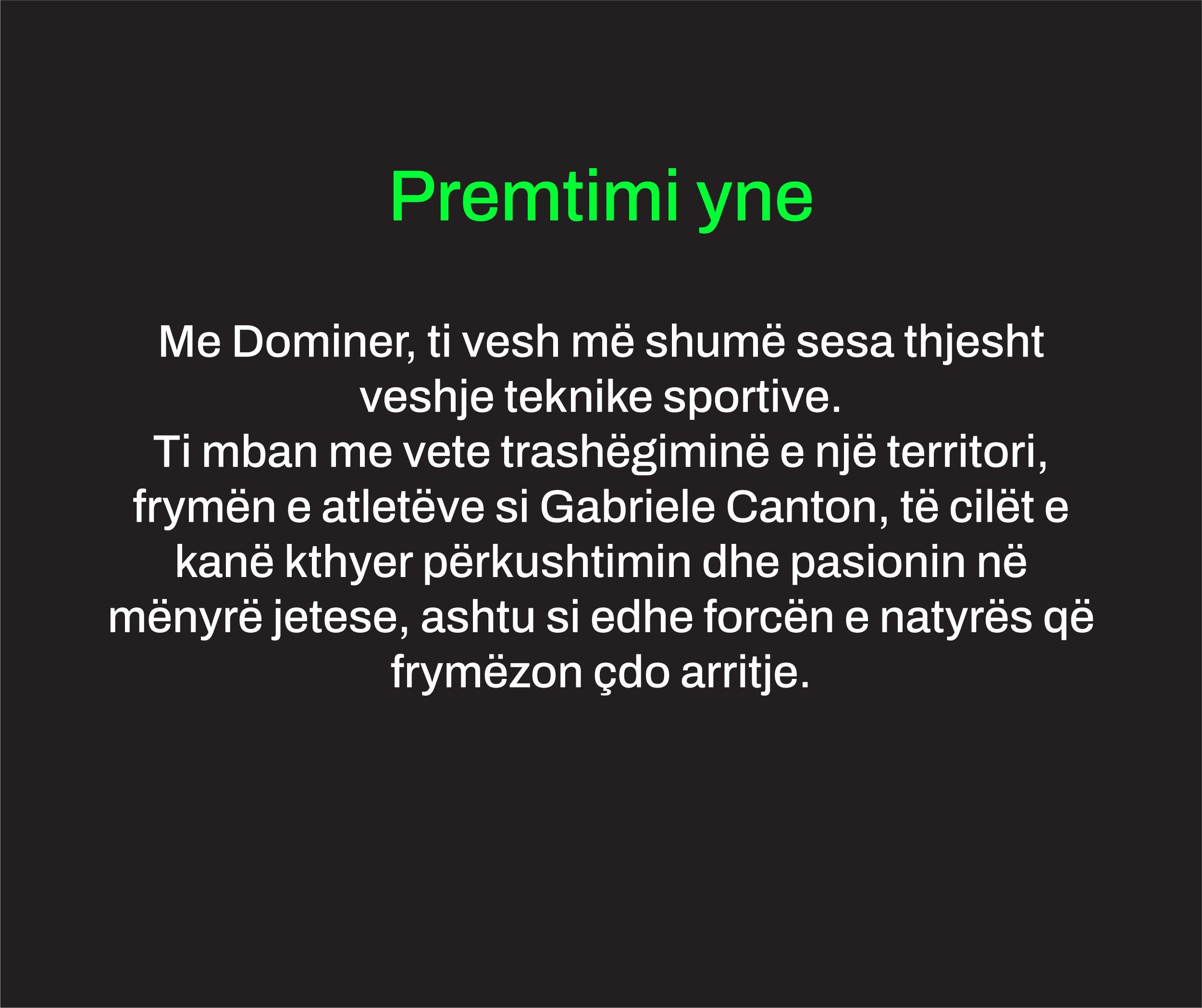 “DOMINER” ngjall konceptin e zotërimit—jo në kuptimin e të mbizotëruarit mbi të tjerët, por të tejkalimit të vetes dhe kufijve të tu. Kjo do të thotë të përballesh me sfida, të rritesh përmes sportit dhe natyrës, dhe të gjesh ekuilibrin tënd.